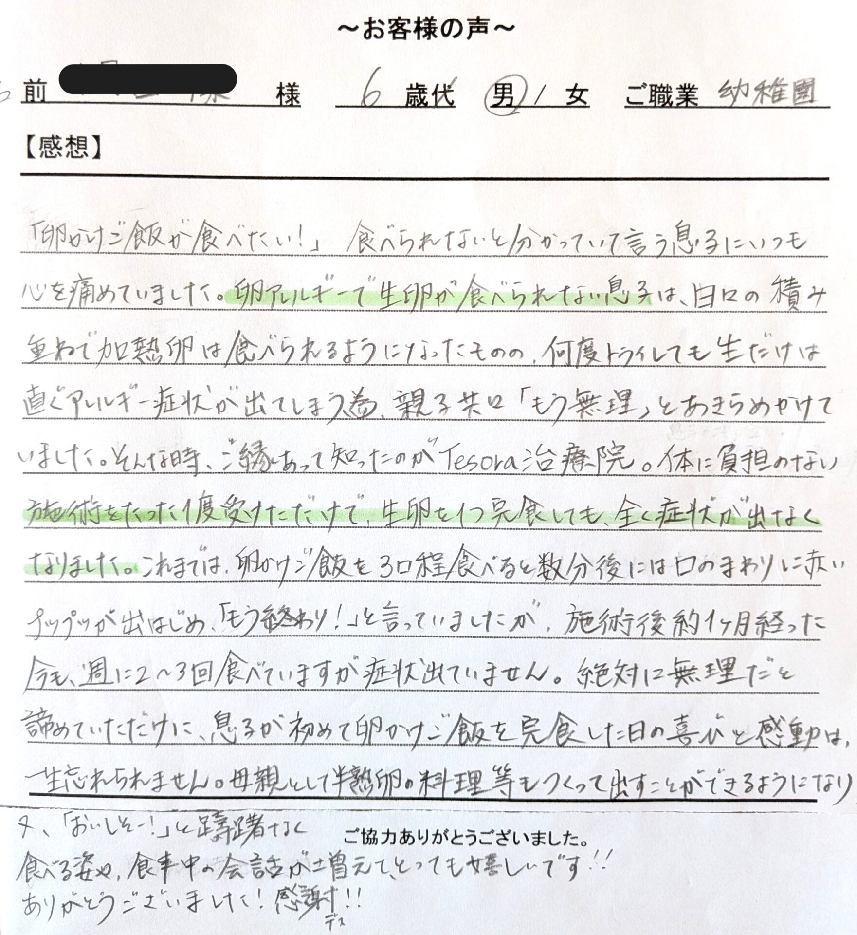 これまでは、卵かけご飯を3口程食べる数分後には口のまわりに赤いプツプツが出はじめ、「もう終わり!」と言っていましたが、施術後約1ヶ月経った今も、週に2〜3回食べていますが症状出ていません。