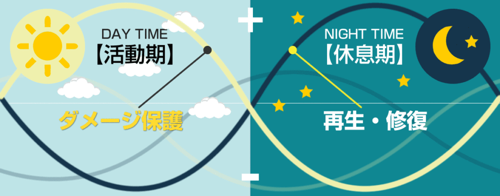 昼間は、紫外線などの外的刺激から肌を守るために「保護」の遺伝子が働き、